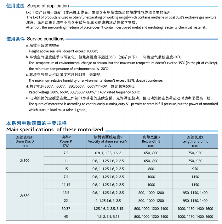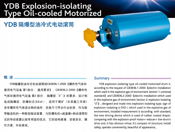 YDB隔爆型油冷式電動滾筒按GB3836.1—2000《爆炸性氣體環(huán)境用電氣設(shè)備 第一部分:通用要求》、GB3836.2—2000《爆炸氣體環(huán)境用電氣設(shè)備 第二部分:隔爆型“d”》的要求,設(shè)計制造成隔爆型、防爆標志為Exd I,適用于煤礦(非采掘工作面)含有爆炸性氣體混合物的場所,安裝尺寸符合行業(yè)標準,作為膠帶輸送機的一種新型驅(qū)動裝置,與防爆電機+減速器+轉(zhuǎn)動滾筒形式的傳動裝置比較有明顯的優(yōu)點,它的結(jié)構(gòu)緊湊、安裝安全、操作方便、外形美觀。 |